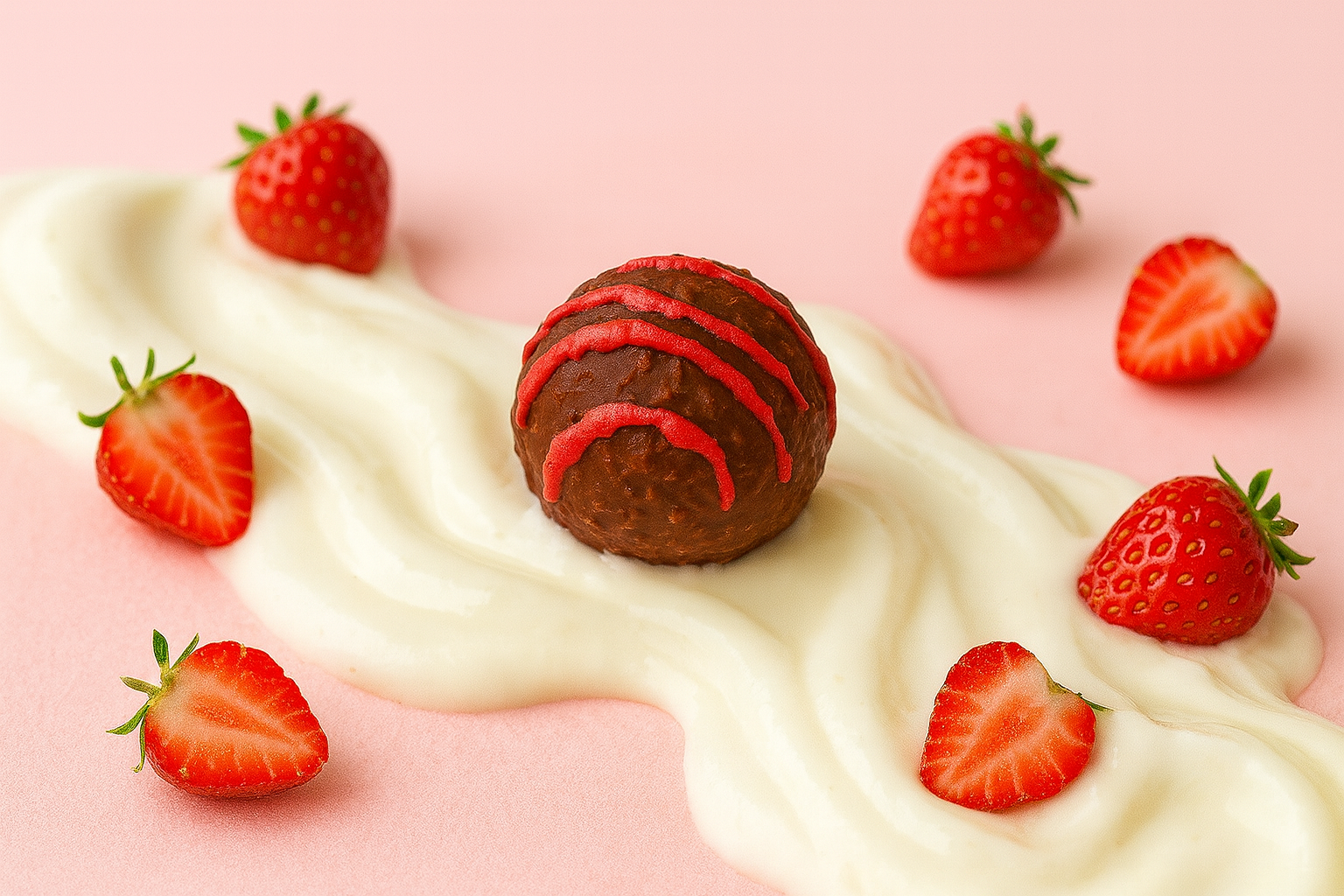 Fruchtige Erdbeere trifft auf cremige Sahne & feinste Schokolade – eine sommerlich-leichte Praline voller Genuss.
